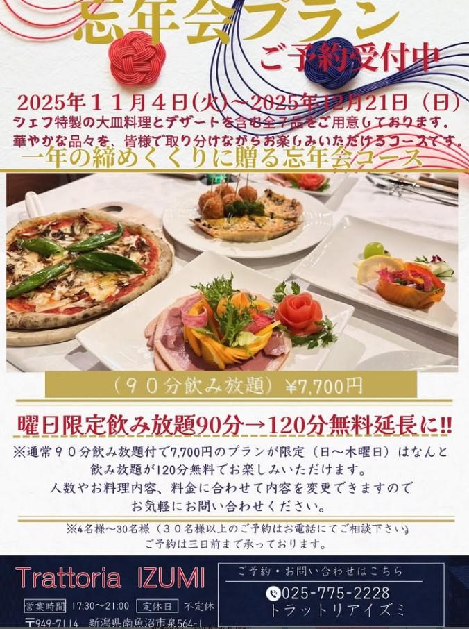 2時間 ※飲み放題終了後、30分以内にご退席をお願いいたします。 |