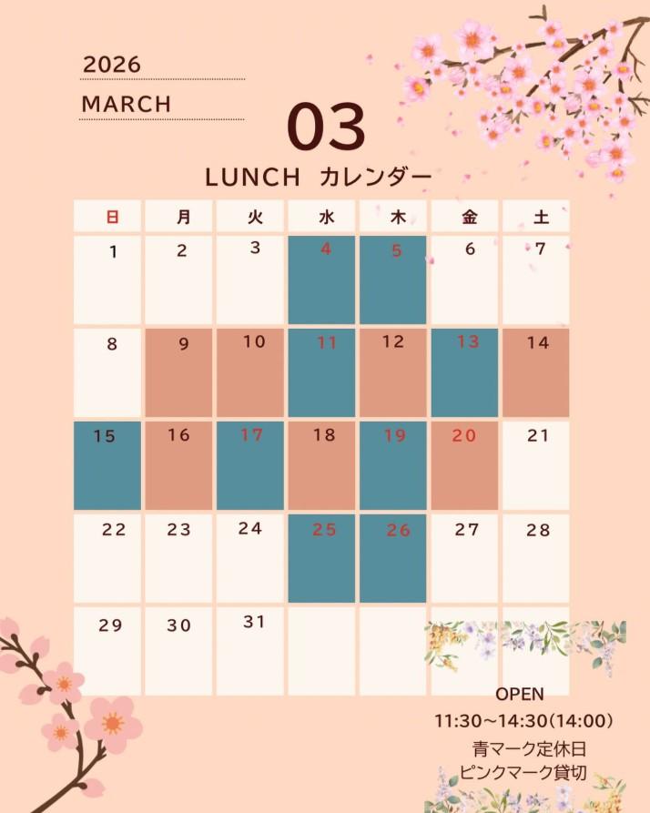 ランチ 11:30~14:30 (L.O.14:00) ディナー 17:30~20:30 (L.O.20:00) ※木曜定休 ※個室1部屋(最大6名様) |