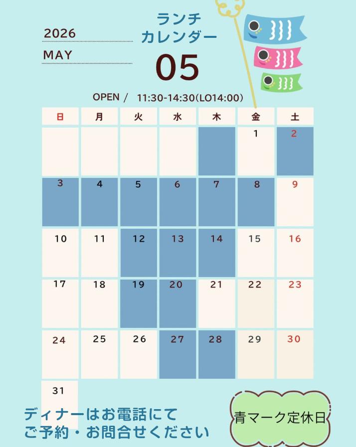 11:30~14:30 (L.O.14:00) ディナー 17:30~21:00 ※ディナーのみ予約制 ※木曜定休 ※個室1部屋 |